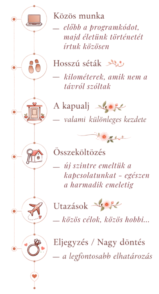 A mi történetünk nem egy kávézóban vagy egy véletlen találkozással kezdődött, hanem egy közös projekten. Programozóként dolgoztunk együtt, egy csapatban, ugyanazon a feladaton – akkor még csak közös sorokat írtunk egy kódban, nem sejtve, hogy egyszer az életünk is összekapcsolódik.